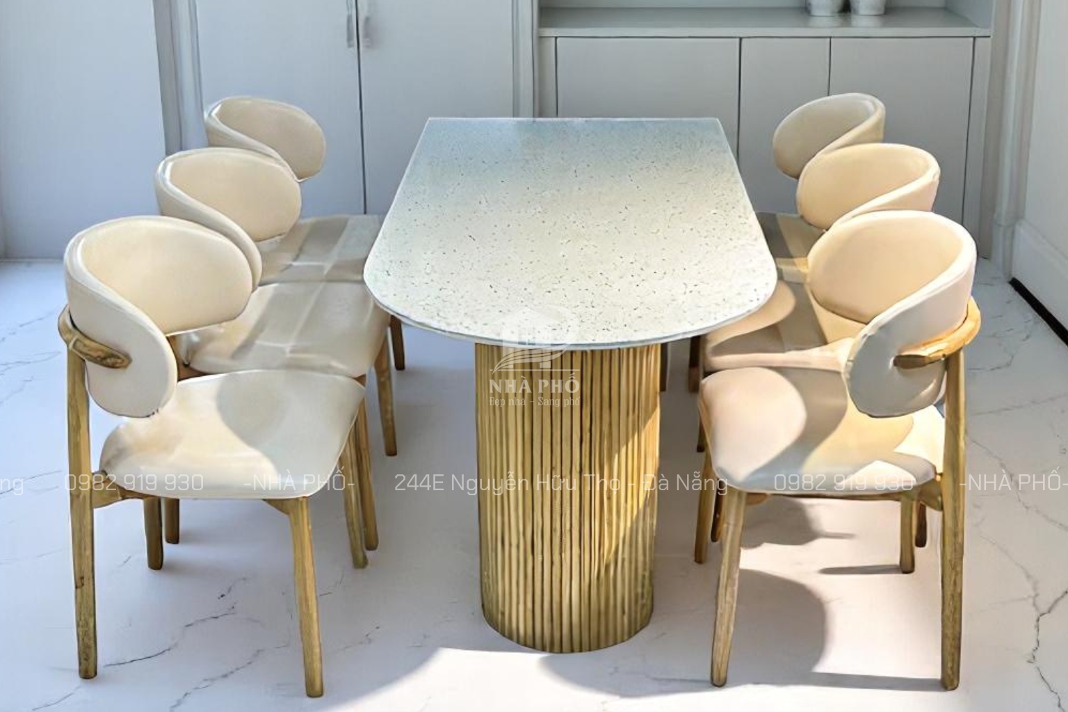 Bàn ăn gỗ dul/d16 là sự kết hợp táo bạo giữa mặt đá terrazzo hiện đại và chân gỗ ấm áp, giải quyết triệt để bài toán của khách hàng: làm sao để phòng ăn vừa sang trọng, thời thượng nhưng vẫn giữ được nét ấm cúng, gần gũi.